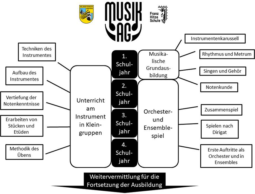 In dieser AG haben die Kinder die Möglichkeit, erste Erfahrungen mit Musik, verschiedenen Instrumenten und dem Zusammenspiel im Ensemble zu sammeln. Der Musikverein Rhode sorgt für qualifiziertes Ausbildungspersonal und stellt für jedes Kind das passende Instrument zur Verfügung. So können die Kinder ihre musikalischen Talente entdecken und entwickeln, während sie gleichzeitig Teamarbeit und Disziplin erfahren.